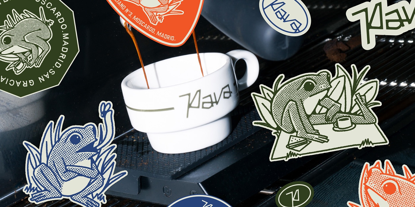 The second pillar is the brand’s mascot: an adorable frog inspired by the local fauna of the Manzanares River, a major landmark of Usera, where the Moscardó neighborhood is located. Illustrated by Norberto Batiz, the frog accompanies Pava’s coffee branding on its menus, mugs, and merchandise, blending in with the clientele by appearing to drink coffee, enjoy a picnic, or simply hunt flies. It serves as a memorable visual link between the café and the community of Moscardó.