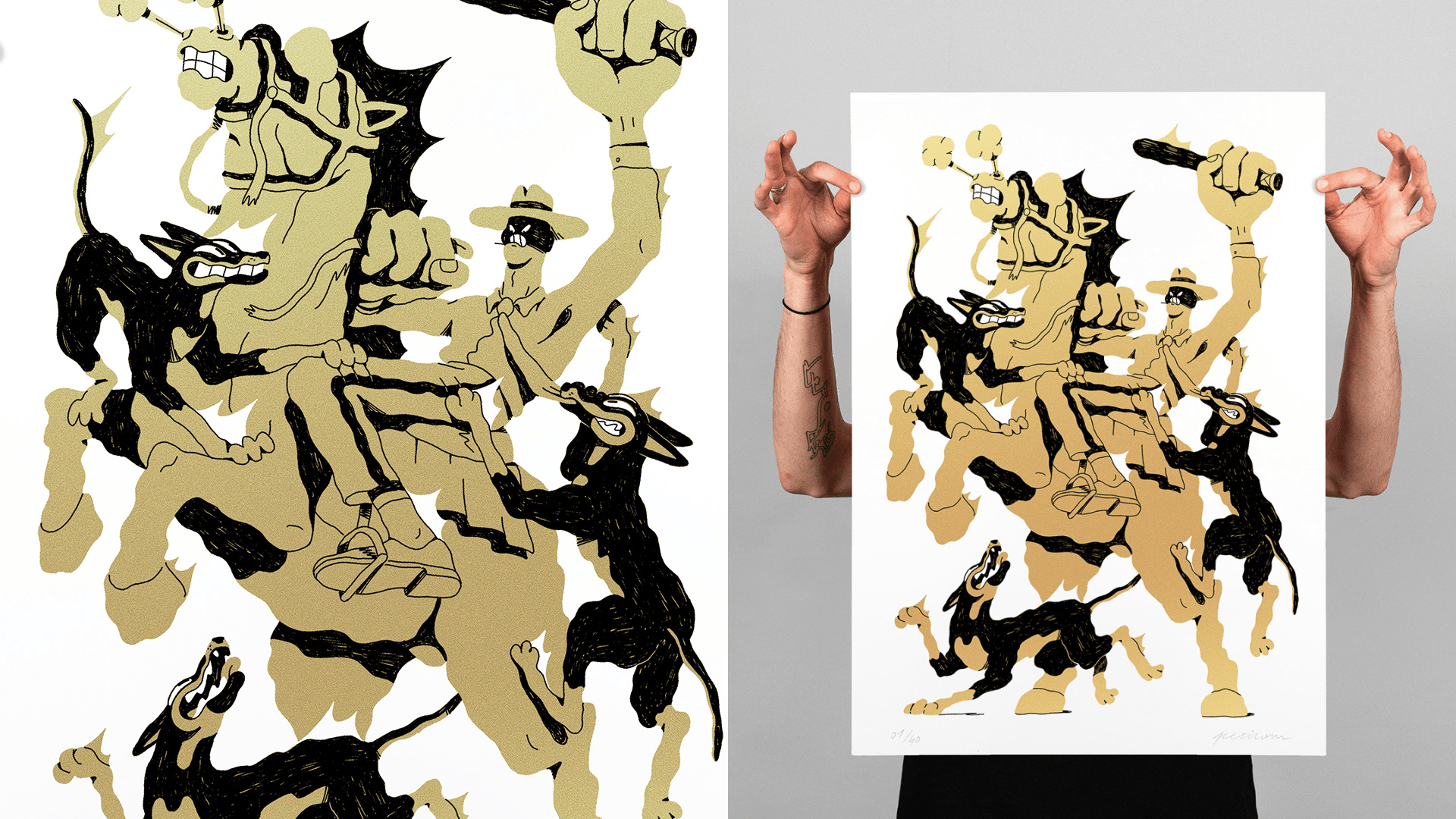From canvases to wood, Petitom knows how to plaster any medium with his vibrant style. Working mostly with 2D animal illustrations, he creates beautifully composed pieces that elevate any space they’re in. The movement and dynamism of his drawings feel like you can hang an animation frame in your wall. He also sells prints of his digital illustrations, sometimes mixing them with stunning typographic work. This is Clash, a 50 x 70 cm silk screen print and Dako, a 4 x 3 feet acrylic on wood painting.